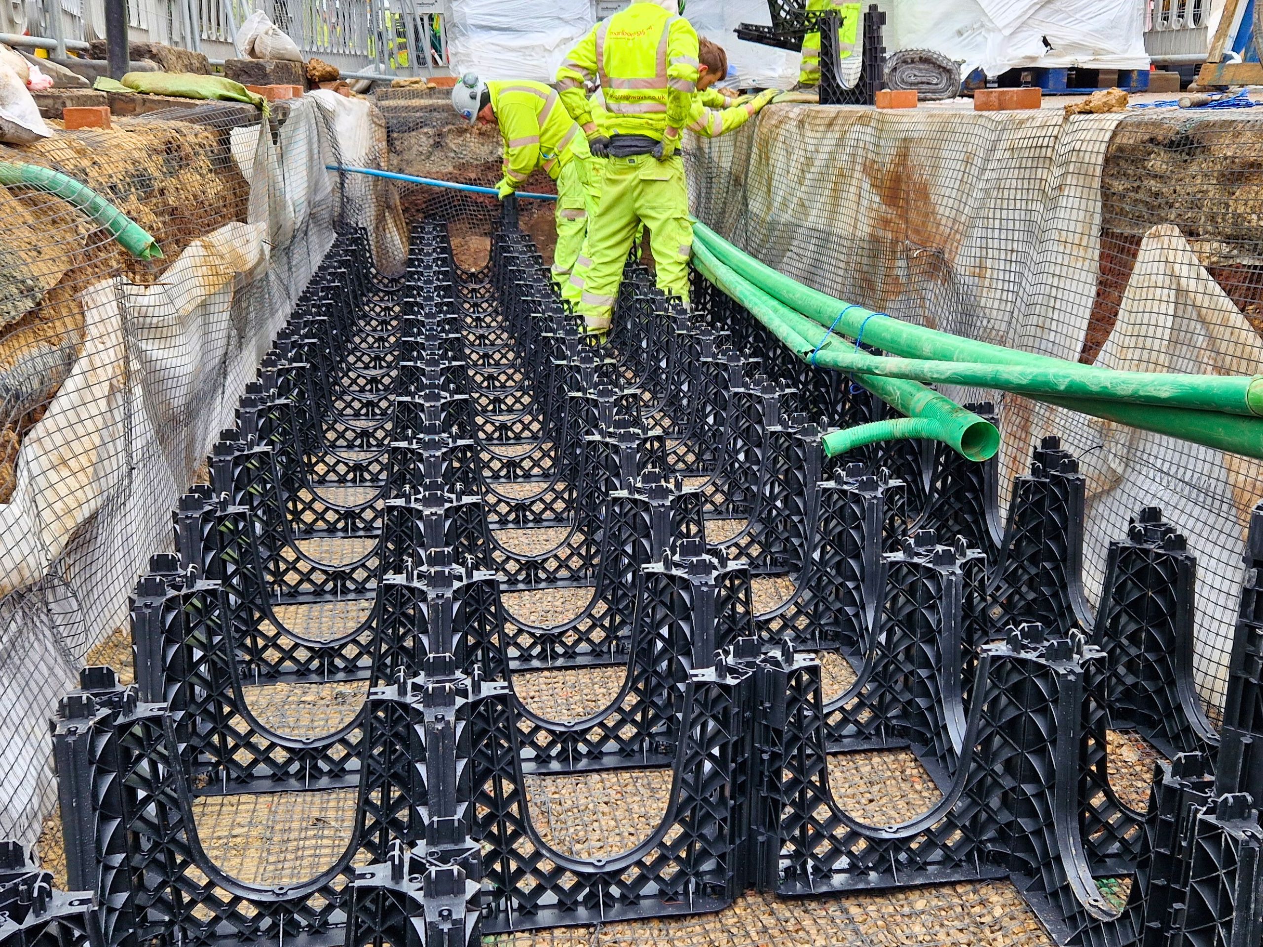 The design therefore needed to integrate effective SuDS performance with robust underground tree support systems, capable of functioning within the structural demands of a paved streetscape.